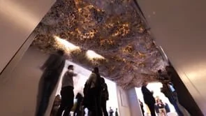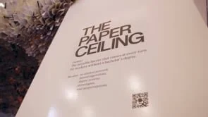 The “Tear the Paper Ceiling” installation was developed in collaboration with artist Samuelle Green. The resumes featured in the work include names and skills and are intentionally not fully visible, as companies often don’t see the skills of STARs, acting as a physical demonstration of the economic tension these workers face.