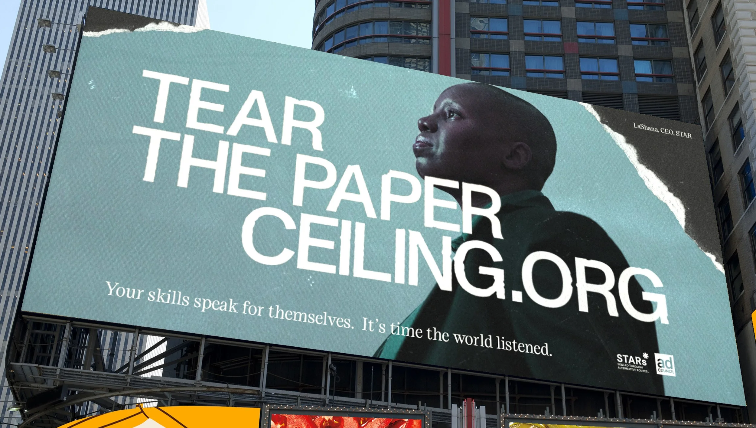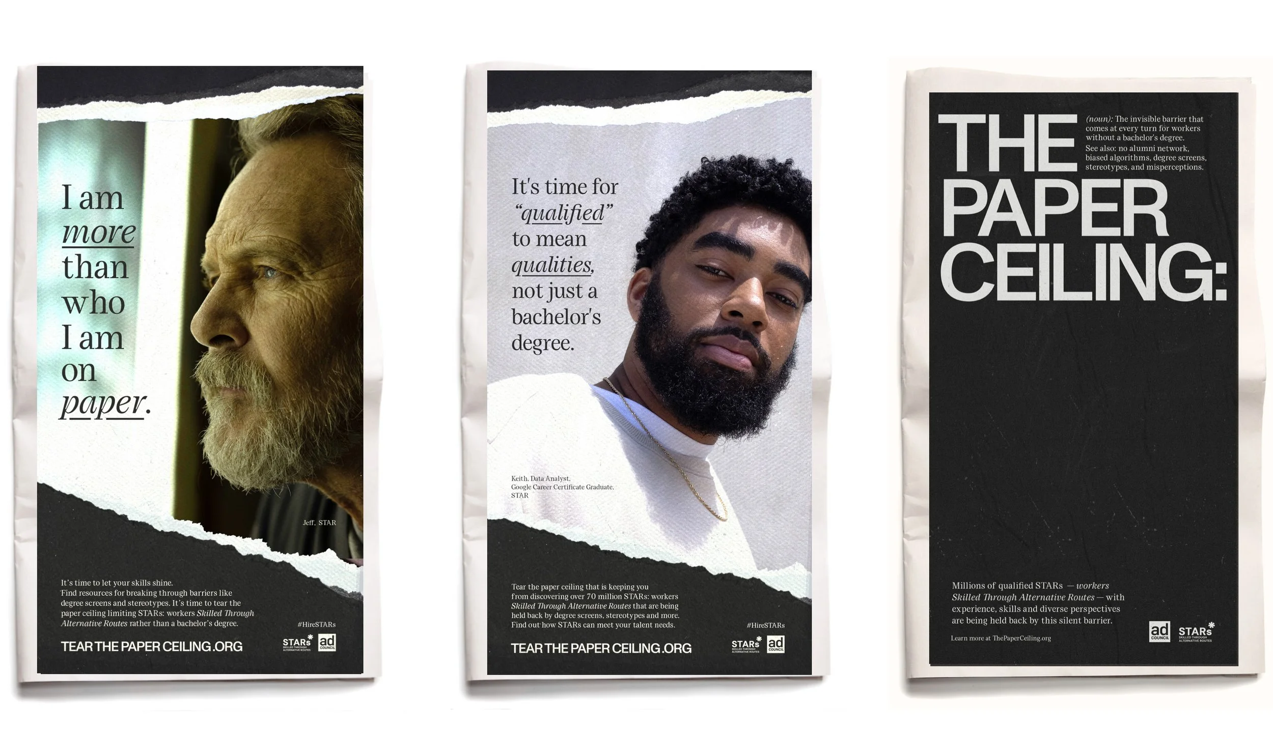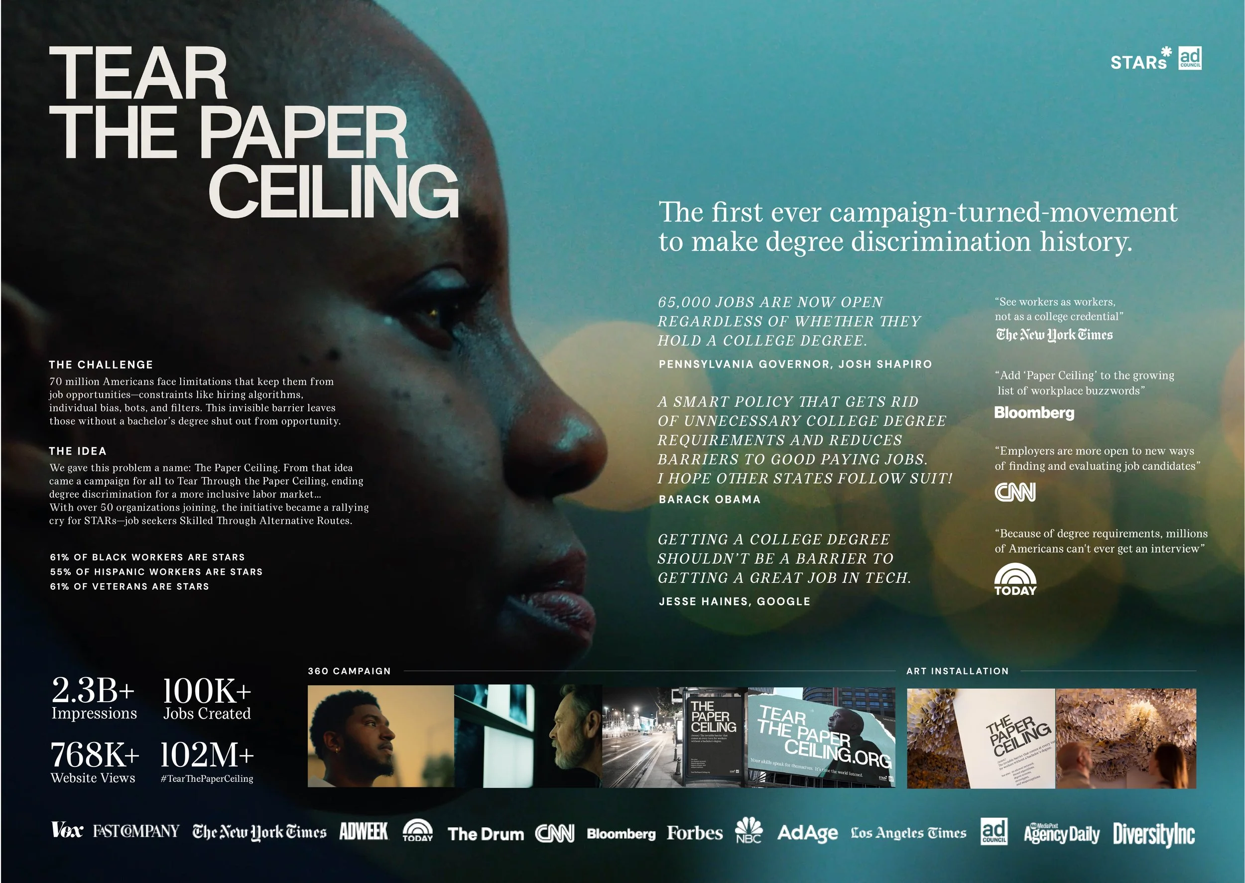 Our Ogilvy New York worked with non-profits the Ad Council and Opportunity@Work, with the support of 50 additional companies and organizations, to launch Tear The Paper Ceiling, an initiative that urges businesses to remove the barriers blocking upward mobility for workers who do not have bachelor’s degrees. This vital cohort—workers who are Skilled Through Alternative Routes (STARs)—makes up over 50% of the workforce but too often faces arbitrary obstacles that preclude them from advancing their careers.